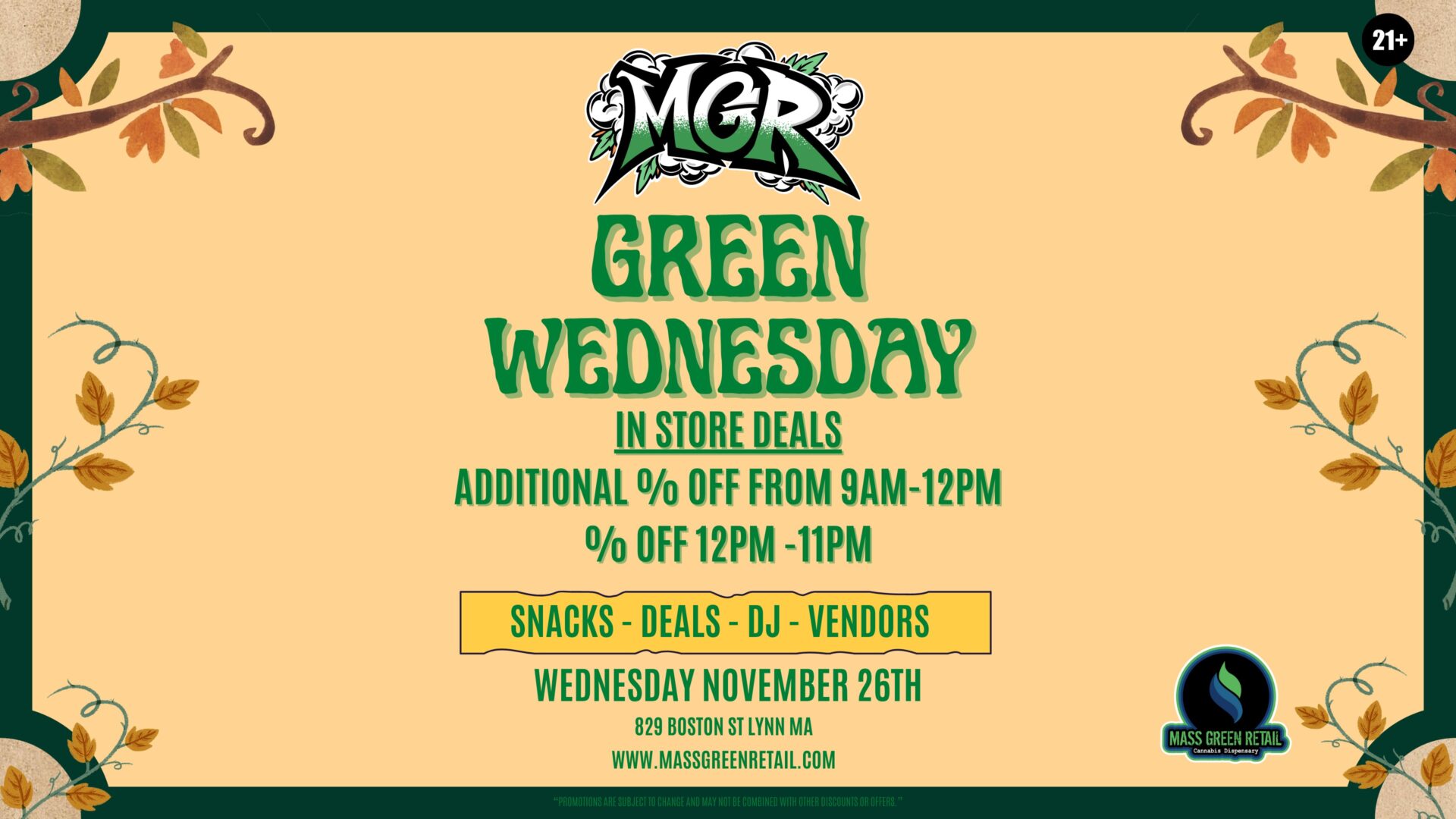 The day before Thanksgiving has become one of the biggest cannabis shopping days of the year, and at Massachusetts Green Retail, we’re going all in. As a recreational cannabis dispensary in Lynn, MA, we’re celebrating Green Wednesday with all-day in-store deals, vendors, music, and a cozy fall vibe right here at 829 Boston St, Lynn, Massachusetts.