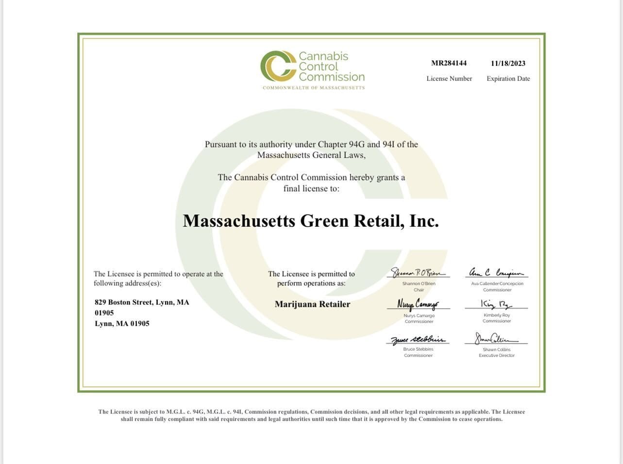 We want to express our heartfelt gratitude to the wonderful residents of Lynn, the elected officials, and our incredible supporters at Massachusetts Green Retail. Today, we are thrilled to share that we have received our final license from the Massachusetts Cannabis Control Commission (CCC). It has been an arduous and challenging journey, but thanks to your unwavering support and belief in us, we have reached this milestone.