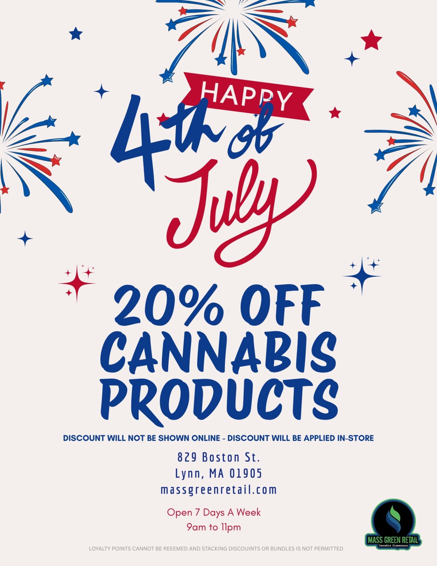 Make this Independence Day even more memorable with a stop at Mass Green Retail in Lynn, MA. On Thursday, July 4, we’re offering 20% off all cannabis products in-store only. Whether you’re planning a backyard BBQ, heading to the beach, or catching fireworks, our team is here to help you find the perfect product to complement your celebration.