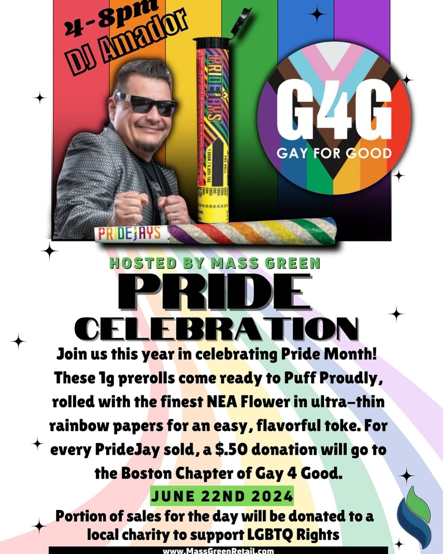 Join us for the Official Mass Green Retail PRIDE CELEBRATION! DJ Amador will be here from 4pm to 8pm spinning the best tunes to celebrate Pride Month! Giancarlo Amador Get ready to Puff Proudly with our lg prerolls, rolled with the finest NEA Flower in ultra-thin rainbow papers for an easy, flavorful toke. For every PrideJay sold, a $0.50 donation will go to the Boston Chapter of Gay 4 Good. (All Month) Save the date: JUNE 22nd 2024 A portion of sales for the day will be donated to a local non-profit to support LGBTQ+ rights. Visit us at Massgreenretail.com #PrideMonth #MGR #CelebratePride #SupportLGBTQ+ #PuffProudly