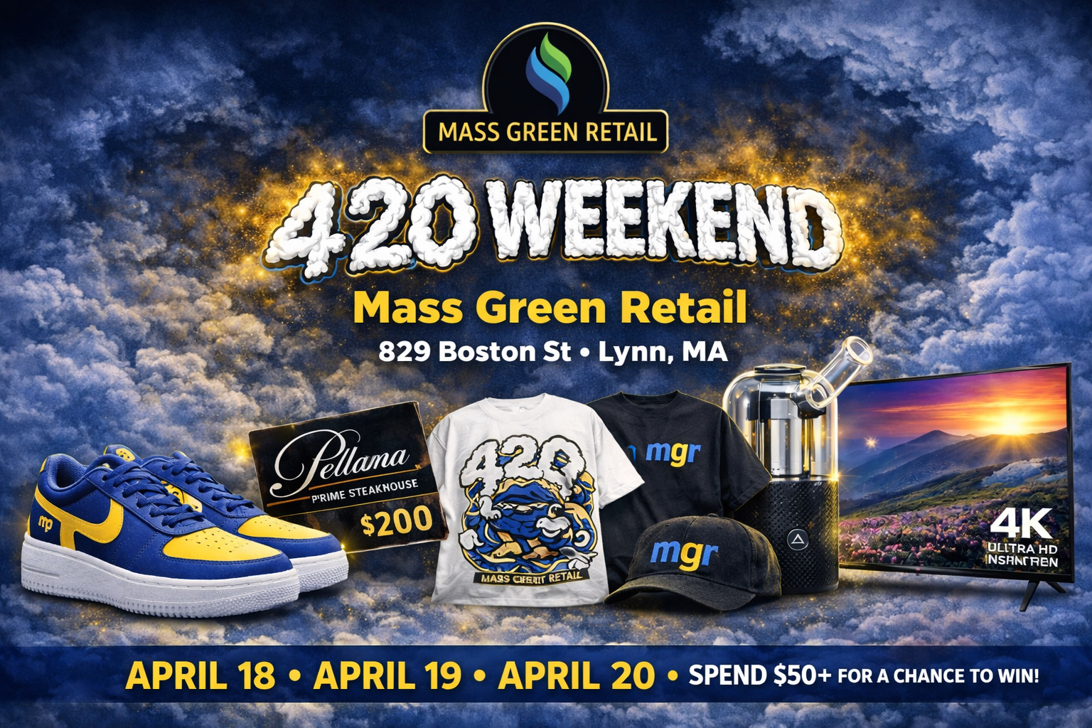 From April 18 through April 20, Mass Green Retail is bringing together storewide promotions, raffle entries, limited-run merch, and major giveaway prizes at 829 Boston St, Lynn, MA. For customers across Lynn, Salem, Saugus, Revere, Peabody, Swampscott, Nahant, Marblehead, Beverly, Danvers, Chelsea, Everett, Malden, and Medford, this is the kind of 4/20 event that makes Mass Green Retail a must-visit destination.